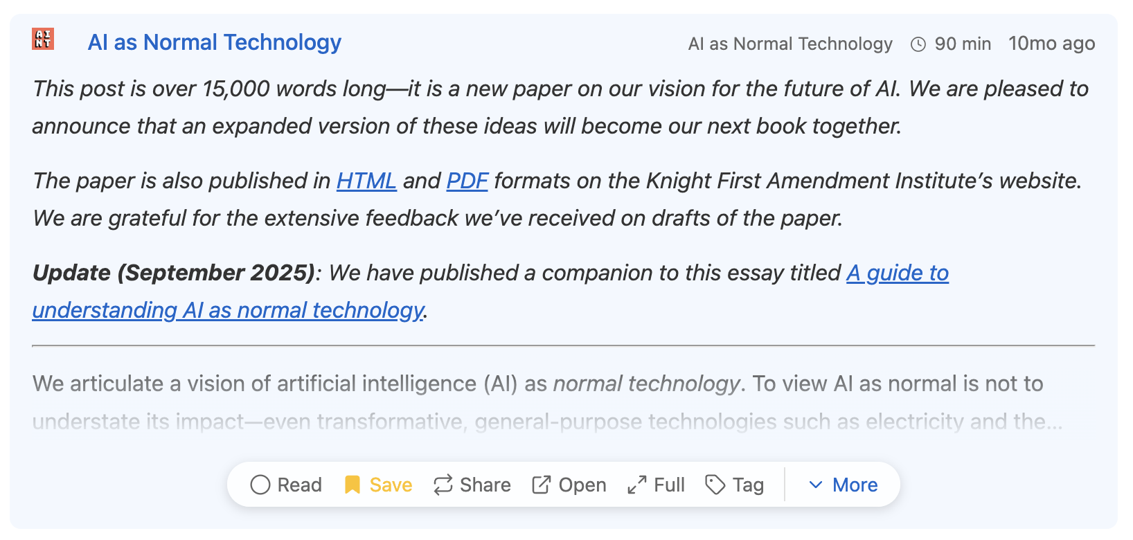 Ironically, RSS readers are usually terrible for actually reading. That's why everyone uses a read-it-later app like Pocket (RIP) or Omnivore (RIP) to actually track reading progress, make highlights, and manage reading lists.